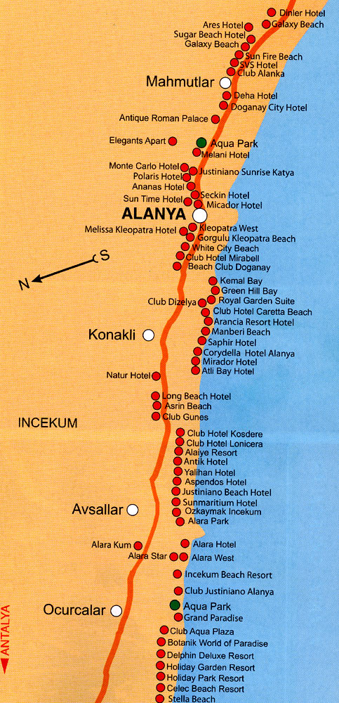 Выбирая курорт для проведения отпуска в Турции, рекомендуем вам остановиться на отдыхе в Алании. Последняя по праву считаеттся одной из самых лучших и популярных. На карте Турции с курортами вы можете увидеть, что Алания расположена на расстоянии 135 километров от международного аэропорта Анталии. На комфортабельном и кондиционированном трансфере, что встретит вас прямо в аэропорту, вы сможете за 1,5-2 часа добраться до своего отеля в Алании.