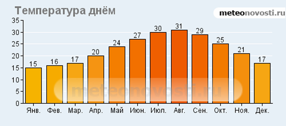Температура днем C° | 15 | 16 | 17 | 20 | 24 | 27 | 30 | 31 | 29 | 25 | 21 | 17 | |