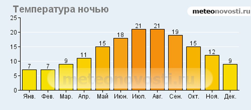 Температура ночью C° | 7 | 7 | 9 | 11 | 15 | 18 | 21 | 21 | 19 | 15 | 12 | 9 | |