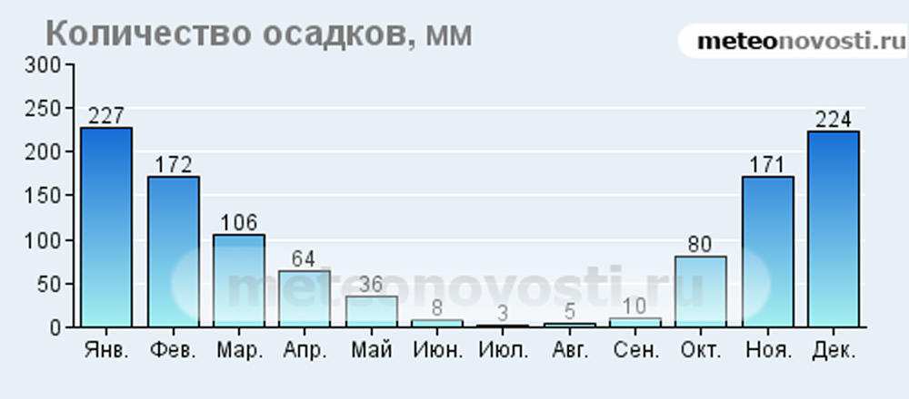 Количество осадком в мм | 227 | 173 | 106 | 64 | 36 | 8 | 3 | 5 | 10 | 80 | 171 | 224 |